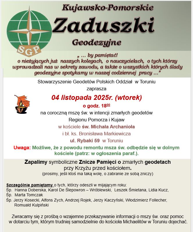 Kujawsko-Pomorskie Zaduszki Geodezyjne - zorganizowane będą (jak corocznie)  w oktawie świąt Wszystkich Świętych przez Stowarzyszenie Geodetów Polskich Oddział w Toruniu.