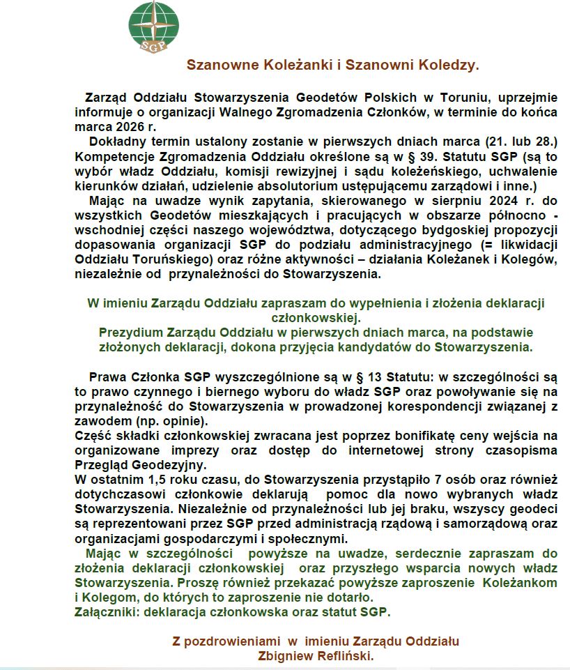 Zarząd STOWARZYSZENIA GEODETÓW POLSKICH - Oddział w Toruniu informuje: