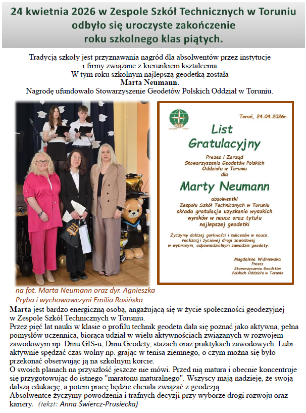 25.04.2025r: - W piątek 24 kwietnia odbyło się uroczyste zakończenie roku szkolnego dla absolwentów Zespołu Szkół Technicznych w Toruniu, w tym klasy geodezyjnej. Wśród adeptów zawodu geodety, najlepsze wyniki w nauce osiągnęła Wiktoria Sowa. Oddział SGP w Toruniu uhonorował absolwentkę listem gratulacyjnym oraz nagrodą rzeczową. ... więcej >>>